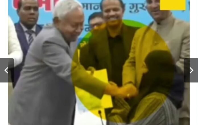 सोशल मीडिया पर एक वीडियो वायरल है, जिसमें दिख रहा है कि नीतीश कुमार नियुक्ति पत्र देते हुए एक मुस्लिम महिला आयुष डॉक्टर के चेहरे से हिजाब खींच रहे हैं।