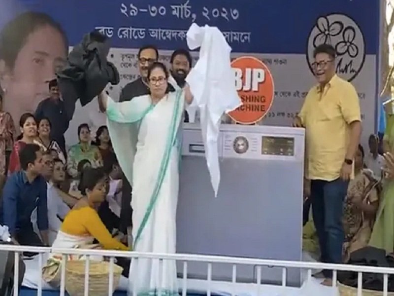 पश्चिम बंगाल की मुख्यमंत्री ममता बनर्जी केंद्र की भाजपा सरकार के खिलाफ कई मुद्दों को लेकर धरना दे रही हैं। उन्होंने धरने के दौरान यह दिखाने की कोशिश की है कि भाजपा में शामिल होने के बाद नेताओं के दाग धुल जाते हैं। उन्होंने इसका डेमो दिखाने के लिए ‘बीजेपी वॉशिंग मशीन’ का इस्तेमाल किया, उसमें काले कपड़े डाले और सफेद कपड़े निकाल दिए। ममता बनर्जी ने कहा कि भाजपा में शामिल होने के बाद नेताओं के दाग घुल जाते हैं। उन्होंने कहा कि जो लोग भाजपा में शामिल होते हैं, बेदाग हो जाते हैं। ममता ने इसका लाइव डेमो भी दिखाया। इसके अलावा ममता बनर्जी मनरेगा योजना और कई आवास और विकास परियोजनाओं को लेकर केंद्र पर हमलावर हैं। उनका आरोप है कि केंद्र सरकार राज्यों को फंड नहीं दे रही है। कोलकाता में रेड रोड पर अम्बेडकर की प्रतिमा के सामने आंदोलन में टीएमसी कार्यकर्ताओं ने एक वॉशिंग मशीन का इस्तेमाल किया। उसमें एक तख्ती लगाई ‘बीजेपी वाशिंग मशीन।’