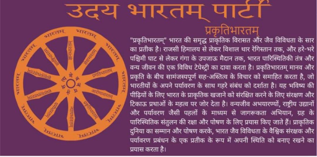 उदय भारतम् पार्टी के 10 सूत्र वाक्यों में एक प्रमुख सूत्र वाक्य है ‘ प्रकृति भारतम् ‘।उदय भारतम् पार्टी के अनुसार ‘प्रकृति भारतम्’ भारत की समृद्ध प्राकृतिक विरासत और जैव विविधता का सार का प्रतीक है।राजसी हिमालय से लेकर विशाल थार रेगिस्तान तक, और हरे-भरे पश्चिमी घाट से लेकर गंगा के उपजाऊ मैदान तक, भारत पारिस्थितिकी तंत्र और वन्य जीवन की एक विविध टेपेस्ट्री का दावा करता है। प्रकृति भारतम् मानव और प्रकृति के बीच सामंजस्यपूर्ण सह-अस्तित्व के विचार को समाहित करता है, जो भारतीयों के अपने पर्यावरण के साथ गहरे संबंध को दर्शाता है। यह भविष्य की पीढ़ियों के लिए भारत के प्राकृतिक खजाने को संरक्षित करने के लिए संरक्षण और टिकाऊ प्रथाओं के महत्व पर जोर देता है। वन्यजीव अभयारण्यों, राष्ट्रीय उद्यानों और पर्यावरण जैसी पहलों के माध्यम से जागरूकता अभियान, ग्रह के पारिस्थितिक संतुलन की रक्षा और पोषण के लिए प्रयास किए जाते हैं। प्राकृतिक दुनिया का सम्मान और पोषण करके, भारत जैव विविधता के वैश्विक संरक्षक और पर्यावरण प्रबंधन के एक प्रतीक के रूप में अपनी स्थिति को बनाए रखने का प्रयास करता है।