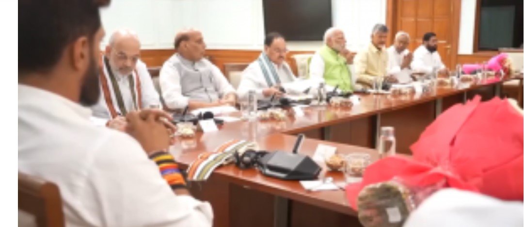 गठबंधन सरकार के जनादेश का सम्मान करते हुए प्रधानमंत्री नरेंद्र मोदी की अध्यक्षता में बुधवार को एनडीए की महत्वपूर्ण बैठक हुई। पीएम आवास, 7 लोक कल्याण मार्ग पर हुई इस बैठक में बीजेपी के राष्ट्रीय अध्यक्ष जेपी नड्डा, केंद्रीय गृह मंत्री अमित शाह, बिहार के मुख्यमंत्री एवं जेडीयू नेता नीतीश कुमार और टीडीपी मुखिया चंद्रबाबू नायडू सहित एनडीए में शामिल अन्य सहयोगी दलों के भी कई नेता मौजूद रहे।