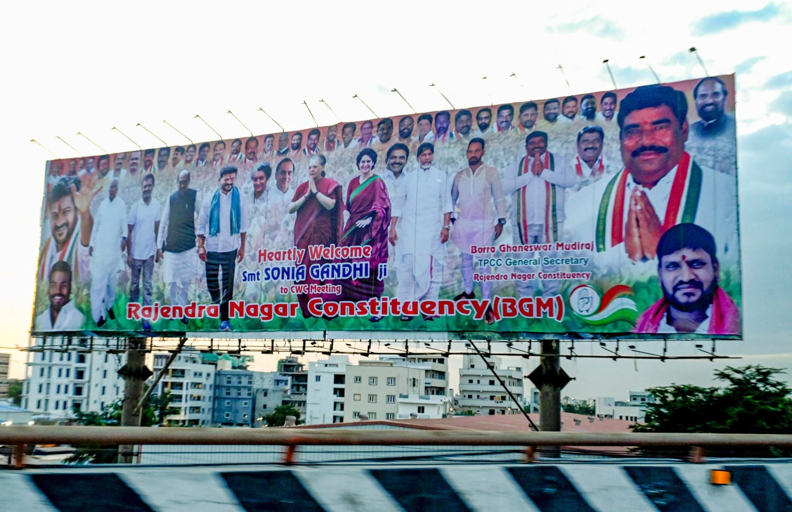 Hyderabad, Sept 15 (ANI): Hoardings with the images of Congress Parliamentary Party Chairperson Sonia Gandhi, MP Rahul Gandhi and party president Mallikarjun Kharge seen on the side of a road, in Hyderabad on Friday, a day ahead of the Congress Working Committee (CWC) meeting. (ANI Photo)